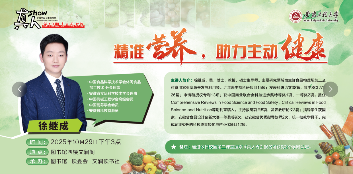 在这个快节奏的现代生活中,我们的生活看似丰富多彩,但却充满了各种健康挑战。您是否经常为了方便而选择吃快餐,却忽略了营养的均衡?又或者您总是忙于工作,很少有时间关注自己和家人每天吃了什么?其实,这些看似平常的生活方式,可能都在不知不觉中影响着我们的健康。我们都知道健康的重要性,但您真的了解如何通过合理的营养摄入来保持身体健康吗?图书馆诚挚地邀请您参加一场精彩的营养知识讲座,本期真人图书馆的特邀嘉宾为我校生物与食品工程学院徐继成教授,他将带我们一起探索营养的奧秘,为您和家人的健康保驾护航!