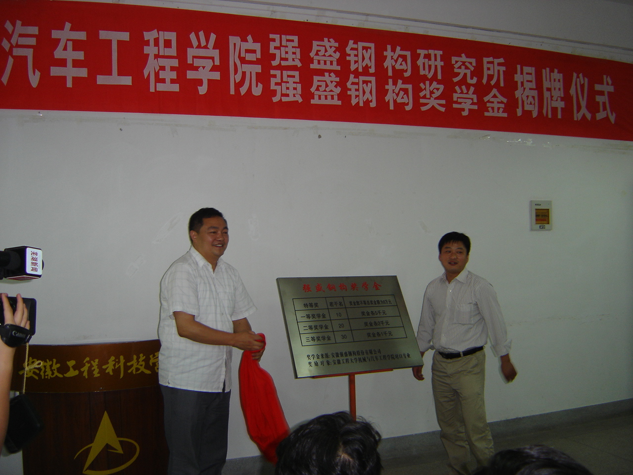 安徽强盛钢构股份有限公司还在我校机械与汽车工程学院设立强盛钢构奖学金,享受对象为该院相关专业,奖学金总额为每年20万元。其中特等每人奖金数不等、特等奖总额为8万元;一等奖10人,每人5000元;二等奖20人,每人2000元,三等奖30人,每人1000元。