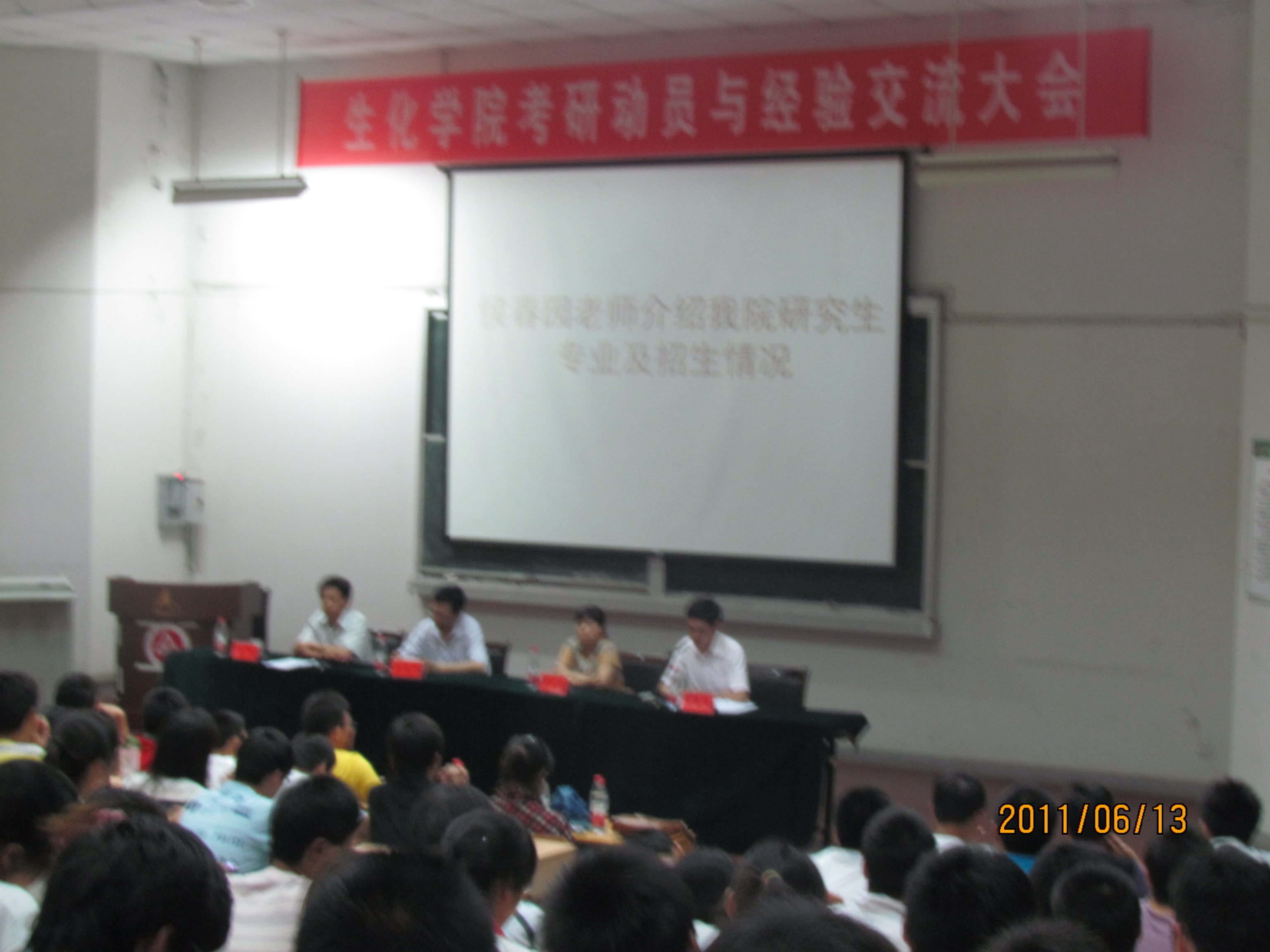 6月13,生物与化学工程学院考研动员与经验交流大会在2J报告厅如期举行。莅临现场的嘉宾有院长徐建平教授、副院长薛正莲教授、党委副书记章兵老师,研究生秘书侯春园老师以及08级辅导员。大会分考研动员和考研经验交流两个阶段进行。本次大会由党委副书记章兵主持。