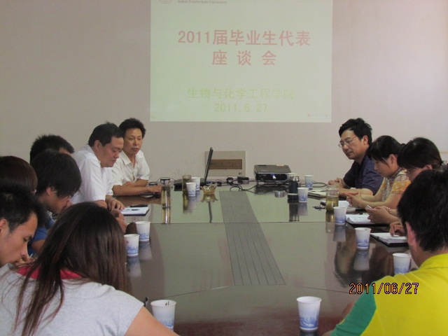 627下午,生化学院在学院会议室召开2011届毕业生代表座谈会,院党委书记王弘、院长徐建平、副院长薛正莲、党委副书记章兵出席了座谈会,来自全院各专业的15名学生代表及毕业班辅导员参加了座谈会,会议由党委副书记章兵主持。