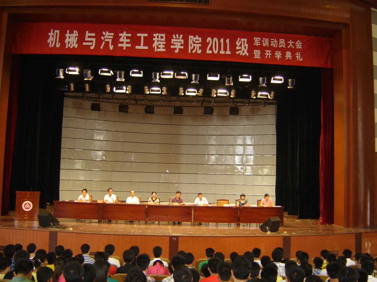 机械与汽车工程学院2011级新生开学典礼暨军训动员大会于9月5日上午930在师生活动中心举行,学院党委书记邓英扣、院长许德章、机制教研室主任于华、车辆教研室主任高洪、装备教研室主任唐铃凤、团委书记黄炜、新生辅导员孙霞、陈刚出席大会,全体新生参加了动员大会。
