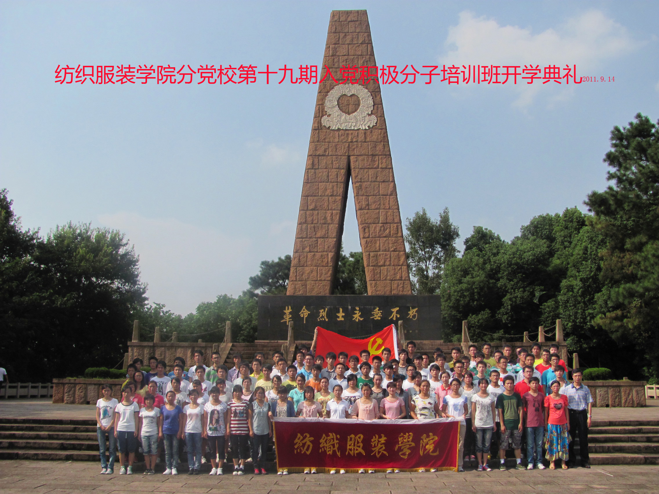 9月14下午,纺织服装学院分党校第十九期入党积极分子培训班开学典礼在芜湖市烈士陵园隆重举行。学院党校副校长、党委副书记刘金斌、本期培训班班主任裘秀群老师以及此次培训班的全体成员出席了此次开学典礼,开学典礼由裘秀群老师主持。