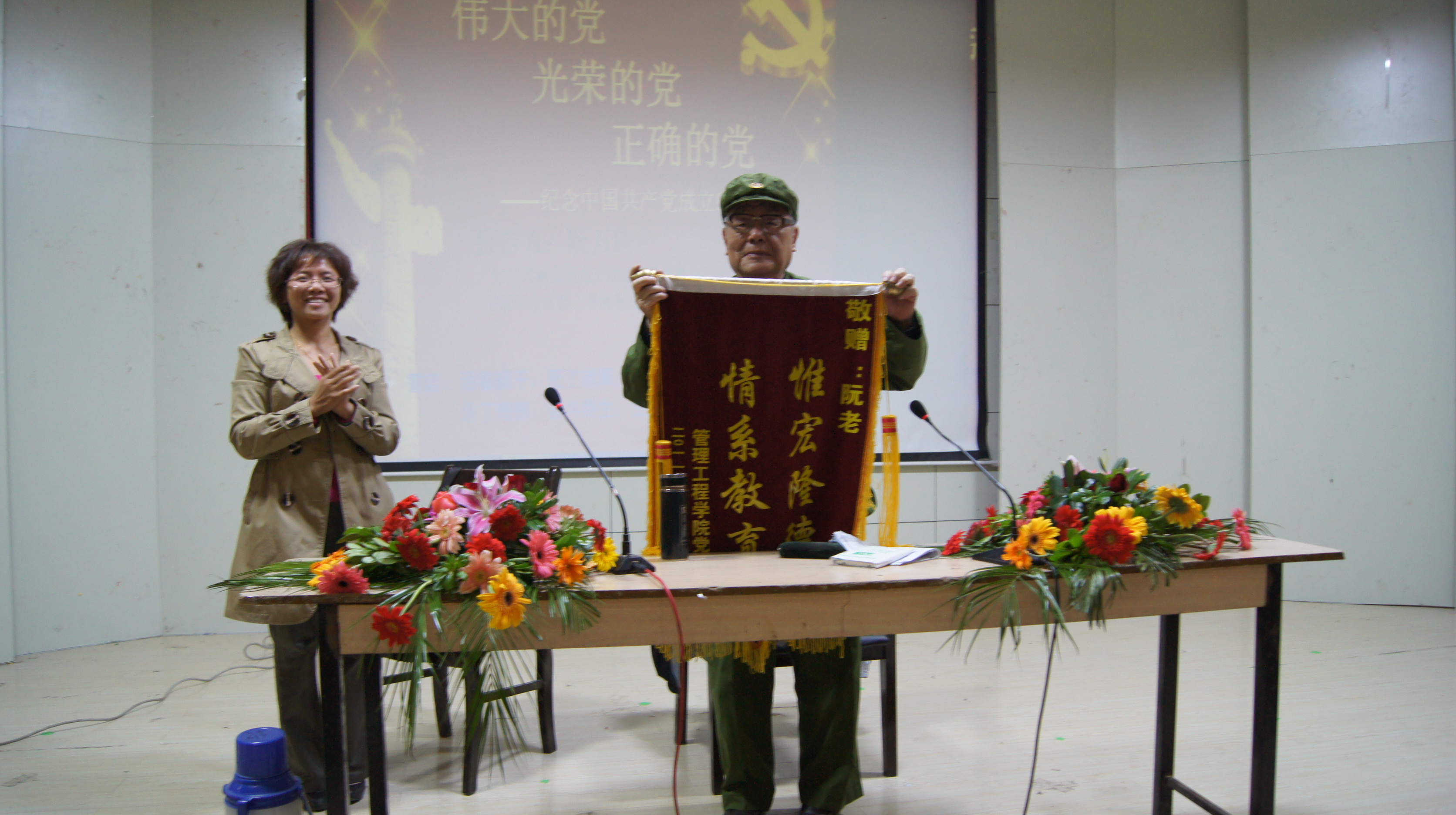 为提升学生党员的党性修养,加强学生党员队伍建设,切实践行科学发展观,建设学习型党的基层组织,管理工程学院党委特邀中共芜湖市委关心下一代工作委员会思想教育报告团副团长、芜湖市军区第三干休所离休干部、新四军老战士阮万钧同志于20111019日下午2:30在校学术报告厅进行主题为“伟大的党  光荣的党正确的党”的报告。此次报告会由我院学生一支部书记黄桂琴主持。此外,莅临报告会的还有芜湖市党史研究会龙科长、管理工程学院团委书记徐晓平和党校班主任何惠研。管理工程学院全体学生党员和入党积极分子共302人聆听了此次报告会。