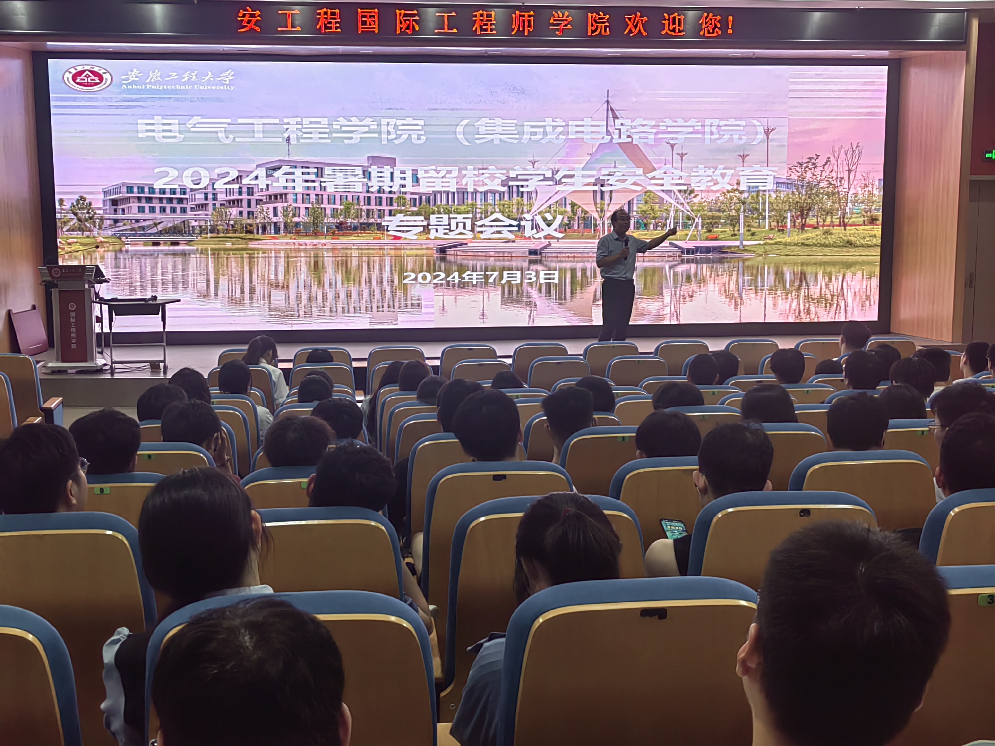 本网讯 为进一步落实学校《关于加强暑期留校学生教育管理的通知》精神,7月3日,电气工程学院(集成电路学院)在国际工程师学院大报告厅召开暑期留校学生安全教育专题会议,以增强留校学生安全防范意识,维护假期校园安全稳定。学院党委副书记迟传德、全体辅导员及800多名留校学生参加了此次会议,会议由迟传德主持。