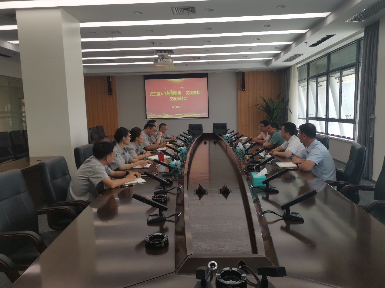 本网讯 7月9日,人工智能学院党委书记任家钱、副院长江本赤、院长助理赵转哲等一行5人到芜湖卷烟厂进行调研交流。双方首先就之前我院与芜湖卷烟厂的合作项目进行了简单总结,并就之后的项目合作形式、合作内容等展开交流讨论。