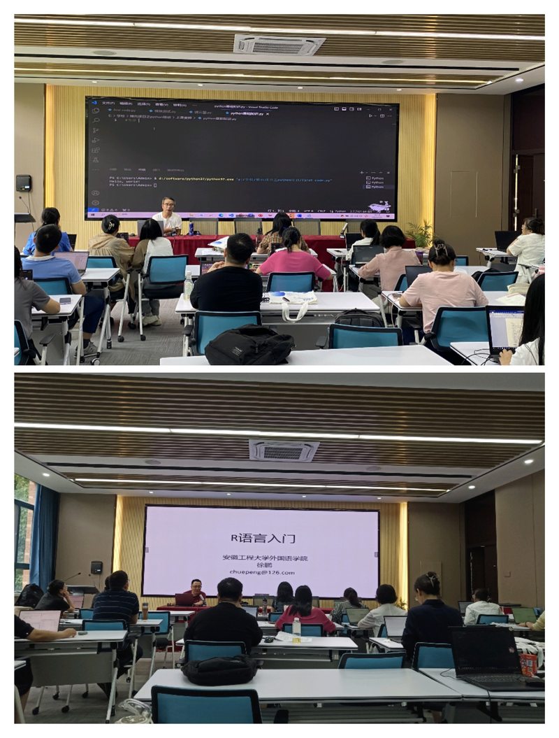 研修内容涵盖了Python在语言数据分析领域的广泛应用,包括文本数据采集、文本清洗、文本分析、文本挖掘、机器学习、情感分析、语言模型构建、语言识别和翻译、数据可视化、社交媒体分析、文档自动化处理等等,适用于自然语言处理、语言学及翻译研究等领域。王家银在机器翻译、信息技术和外语教学融合等领域有深入研究,他不仅从理论上进行了深入浅出的讲解,生动地阐述了Python作为数据分析和机器学习的强大工具,还通过实际案例和项目,让学员们动手实践,亲身体验Python在自然语言处理、教学、办公自动化等多个领域的实际应用。徐鹏主讲了R语言基础知识以及在数据处理、统计分析和机器学习等方面的基本应用。