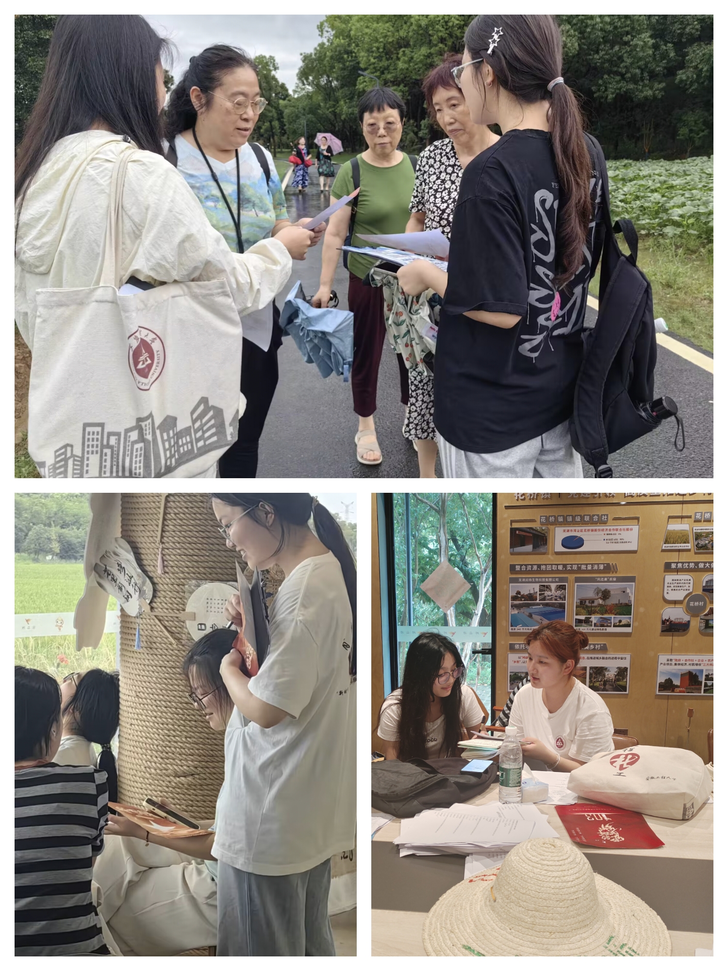 七十份调研日志、七十万步、三百份问卷、二十场面对面访谈……团队成员们不畏酷暑,穿梭在鸠兹湾的各个角落,通过走访调研当地村民、工作人员及游客等,了解了鸠兹湾特色的“党建引领、农民主体、社企共建、促进共富”的乡村振兴模式,并总结其文旅发展与“艺创”+模式的先进经验,探索新时代背景下乡村振兴的新路径。在与各群体访谈交流的过程中,团队成员们惊叹于乡村的旧貌新颜,用认真的态度和专业的精神,仔细记录着乡村的发展和变化,收集宝贵的数据和信息。每一份问卷的填写,每一次深入的访谈,都凝聚着团队对乡村发展的关注与思考。
