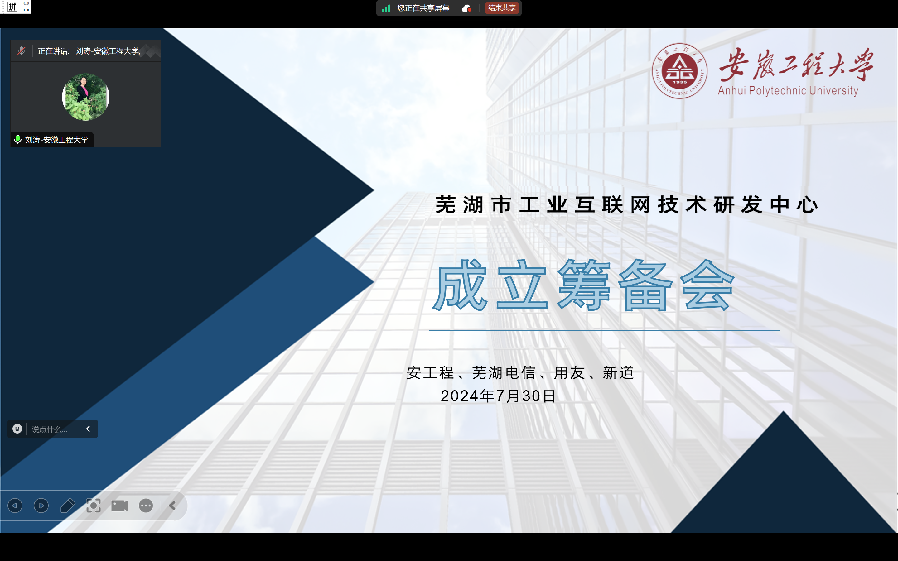 本网讯 7月30日,计算机与信息学与中国电信股份有限公司芜湖分公司、安徽用友软件有限公司及新道科技股份公司通过线上会议形式,共同筹备建设“芜湖市工业互联网技术研发中心”。计算机与信息学院副院长刘涛、中国电信芜湖分公司总经理助理陈佳、安徽用友软件有限公司总经理张远学、新道科技股份有限公司安徽分公司总经理王小明携校企研发中心建设团队参加了会议。