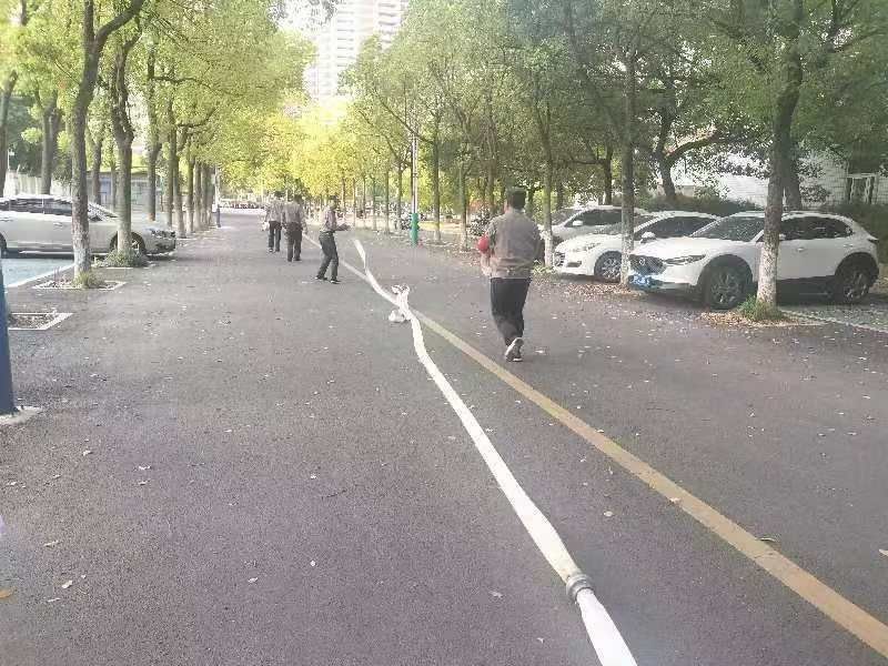 保卫处结合校园目前的安全形势,制定了详细的演练预案。把安保力量分成三个灭火小组,每个小组分工明确、责任到人。随着指挥员下达演练开始的指令,七人组成的灭火救援组开展了水带铺设和预备干粉灭火器扑救环节,另外三人组成的疏散救援小组开始把火场周边的易燃物品进行搬运、隔离。待现场人员全部到达指定位置和120米水带铺设完成后,指挥员再次下达“出水”指令,一条水龙喷射而出。经过5分钟紧张有序的扑救,火灾被成功扑灭,此次演练顺利完成。