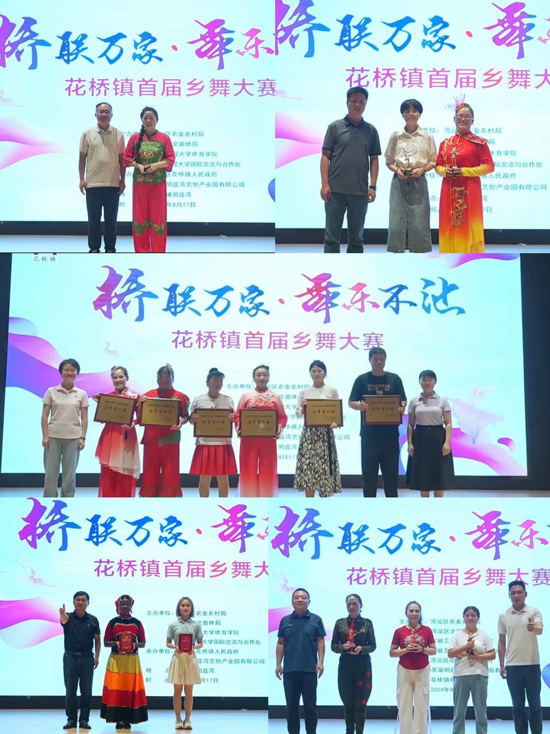 本网讯 8月17日,由体育学院和国际交流与合作处、湾沚区农业农村局、湾沚区文旅体局联合主办,湾沚区花桥镇人民政府、芜湖鸠兹湾艺创产业园有限公司承办的“桥联万家,舞乐不沚”首届乡村舞蹈大赛在湾沚区花桥镇鸠兹湾圆满落幕。湾沚区委常委、宣传部部长单增劲,花桥镇党委书记程小永、花桥镇党委副书记、镇长吴琴之,湾沚区农业农村局副局长陈斌、湾沚区文旅体局党组成员、区文化馆馆长唐俊峰,花桥镇九十殿村江南书院创办人汤大立、国际交流与合作处教师代表、体验产业学院执行院长薛保红出席活动。湾沚区文联副主席郑新华、全国广场舞联合会副主席杨君萍、我校李品仙、徐玲以及杨菲菲三位教师担任评委。