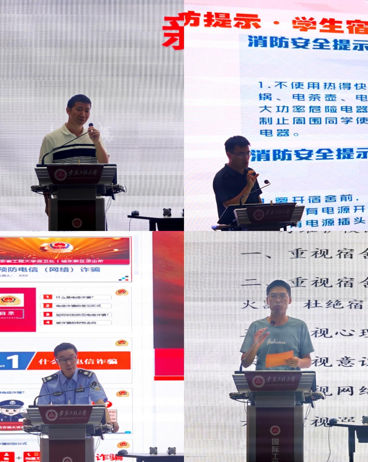 秦广虎从维护生命财产安全的角度向师生强调维护校园安全的重要性和必要性,指出校园安全是事关师生切身安全的大事,全体师生都是安全守卫员、参与者,即是安全的第一责任人也是受益者,师生务必齐心协力,共筑和谐安全校园。苏醒和徐伟分别从改善和提升新校区食堂餐饮卫生安全、书院外墙维修、宿舍电源线路改造、户外设置常规维护、消防设备升级等方面进行介绍和知识普及,号召同学们积极参与平安校园建设的各项活动。赵荣俊向师生详细介绍了当前电信诈骗的常见手段、特点和危害,结合实际案例,以案说法,生动形象地讲解了如何识别和防范电信诈骗。在注意防范电信网络诈骗的同时,不要被“高薪”噱头蒙骗,更不要抱有侥幸心理,非法收购、出租、出借、出售电话卡和银行卡,否则可能成为电信网络诈骗犯罪的“帮凶”。辅导员代表孙志鹏带领学生们共同学习了《机械与汽车工程学院校园安全倡议书》,号召学生们筑牢安全底线,为建设平安校园做贡献。