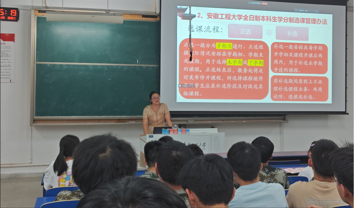 为了帮助新生更好的了解学分制选课,数字素养与技能中心主任汪婧对学校关于学分制选课的具体方案和实施细则进行了介绍,教务员韩少杰老师对选课系统进行了细致地演示,为新生提供了针对性地选课指导。