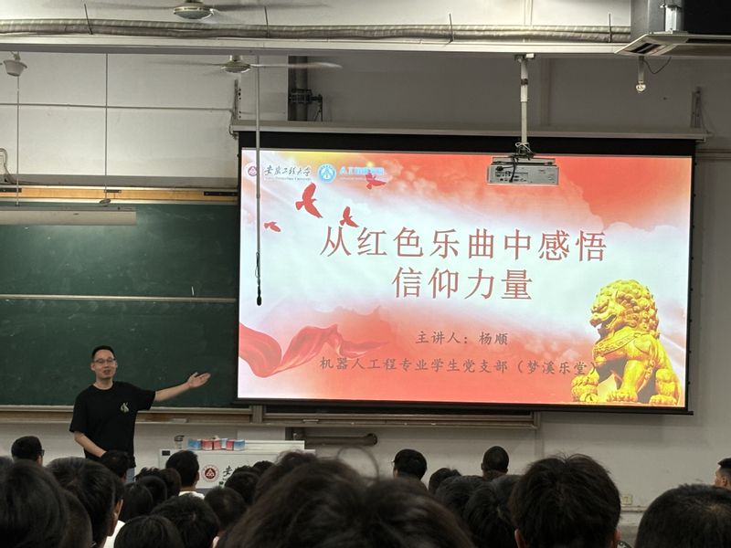 本网讯 为做好新生入党启蒙教育,加快构建同向同行、互融互通、共建共享的“思政+美育”协同育人模式,以美育人、以文化人,着力增强育人实效。9月10至12日,人工智能学院党委在6教214举办“从红色乐曲中感悟信仰力量”美育思政专题讲座。讲座由机器人工程专业学生党支部书记杨顺主讲,2024级全体新生参加。