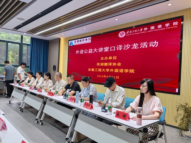 本网讯 9月21日,由芜湖市翻译协会、外国语学院联合主办的“外语公益大讲堂口译沙龙活动”于外国语学院209会议室和腾讯会议同时线上线下开展,芜湖翻译协会会长刘进及其他主要领导、外国语学院院长(主持工作)唐雪梅教授、科研副院长韩利敏教授、学院教师代表及全体MTI研究生现场出席了此次大讲堂,同时还有来自芜湖市数百名师生、口译爱好者参加了此次活动。活动由韩利敏主持。