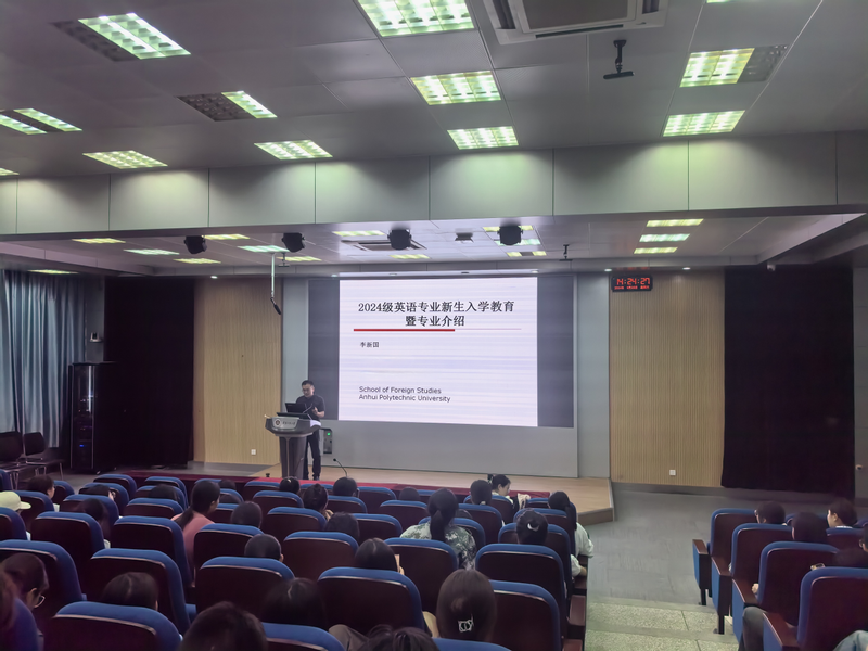 李新国从专业简介、办学历史、专业特色、专业优势、办学条件和师资力量等方面进行了详细介绍,全方位的展示了新文科背景下我校英语专业的建设成果,并解读了学校的个性化人才培养改革方案。报告中,“外语短剧表演”、“口语广场-英语角”、“用英语讲好中国故事”等品牌活动以及各类学科竞赛,激发了新生对于专业探索的欲望;俞敏洪、孙宁、杨澜等名人案例帮助新生了解了语言的价值和魅力,认识到语言不仅具有人文价值与经济价值,同时也是核心竞争力和新质生产力;优秀校友的经历则鼓励新生主动以优秀学长学姐为榜样,在新的征程上打好专业基础、拓宽国际视野,讲好中国故事,做一个有益于国家和人民的人。