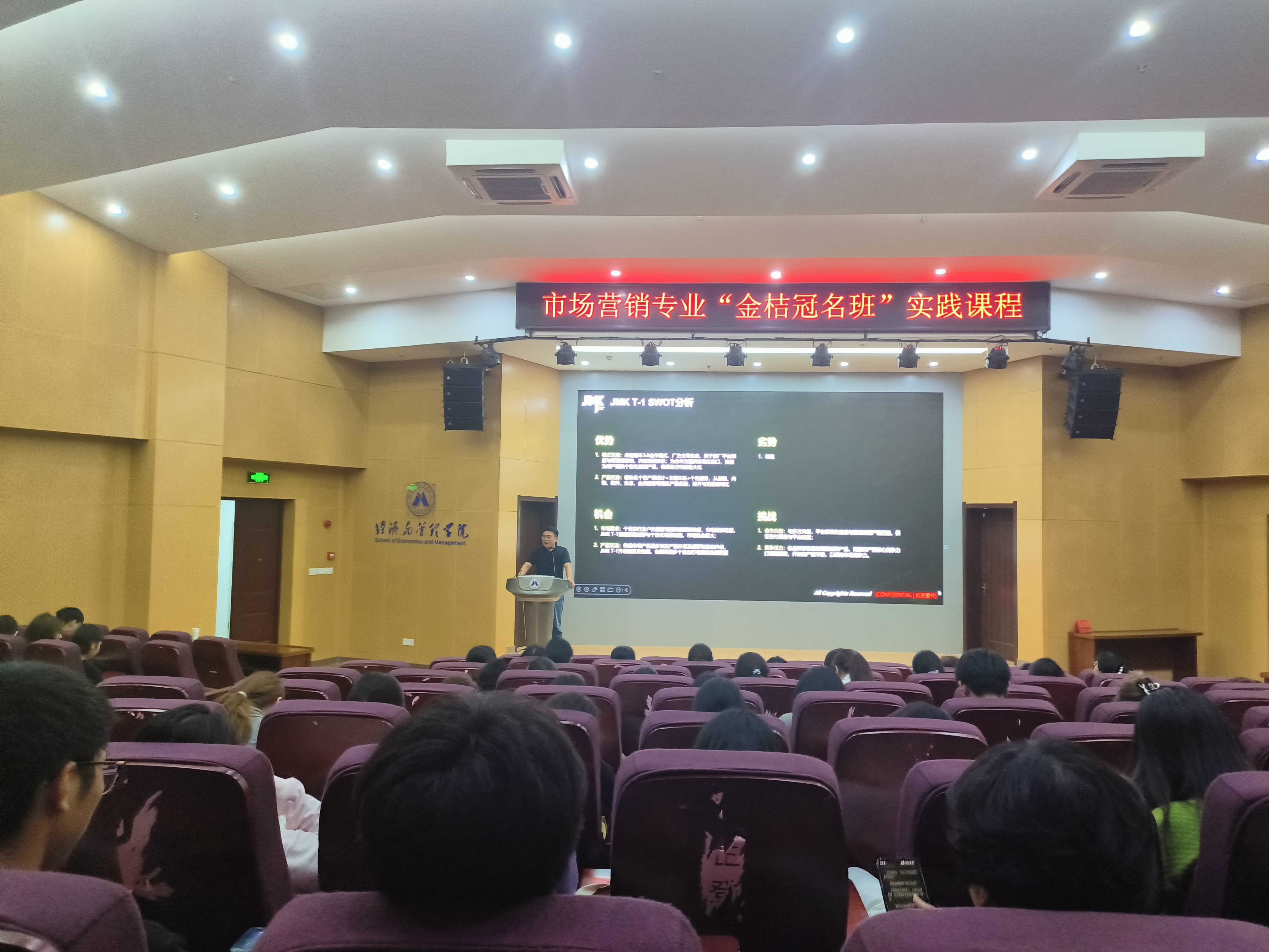 本网讯 为深入推进个性化人才培养方案,创新冠名班建设内容,经济与管理学院“金桔”冠名班实践课程系列讲座于9月27日晚在C座7楼报告厅顺利开讲。芜湖金桔科技有限公司总经理马民丰、学院副院长桂云苗、学院“金桔”冠名班全体同学及市场营销系全体教师参加。