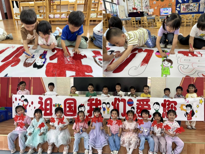 中班小朋友用自己的小手描绘对祖国的热爱。他们拿起画笔,铺开长卷,用天真的色彩,展现爱国情怀。小小画家们伏在画布上或蹲、或跪、或趴,一笔一画绘出对未来美好的憧憬,对祖国母亲深深的祝福!