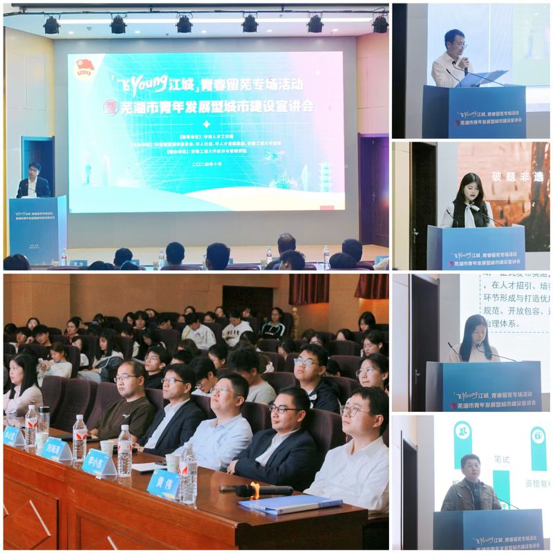 本网讯 为了推进芜湖市城市建设发展,帮助大学生对芜湖市人才发展拥有进一步的认识,同时帮助大学生更好的进行未来规划,经济与管理学院联合芜湖团市委、市委人才工作局、市人社局、市人才发展集团、校团委于10月11日在C座7楼报告厅举办“飞Young江城”青春留芜专场活动暨芜湖市青年发展型城市建设宣讲会活动。团市委青年发展部部长黄伟、市委组织部公务员考录培训科副科长王大远、芜湖市紫云英人才服务有限公司经理谢文婷应邀出席,经济与管理学院党委书记水心宝、党委副书记刘海涛、校团委副书记姚伟波,学院教授李小东以及经济与管理学院各专业学生代表200余人共同参加。