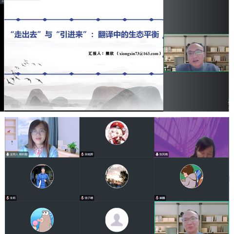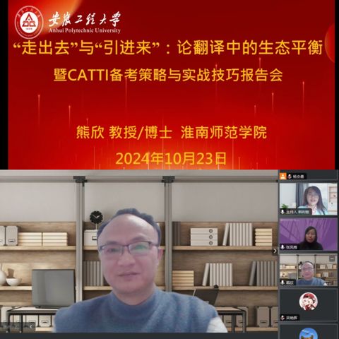 本网讯 10月23日,外国语学院通过腾讯会议开展了全国翻译专业资格(水平)考试(China Accreditation Test for Translators and Interpreters,简称CATTI)备考策略与实战技巧报告会,活动邀请淮南师范学院教授熊欣博士,做了题为《“走出去”与“引进来”:论翻译中的生态平衡》的学术报告,针对CATTI二级笔译考试对研究生进行了考前指导。副院长韩利敏教授、张凤梅教授、学院硕士生导师以及全体研究生参加了此次线上学术交流活动,活动由副院长韩利敏在线主持。