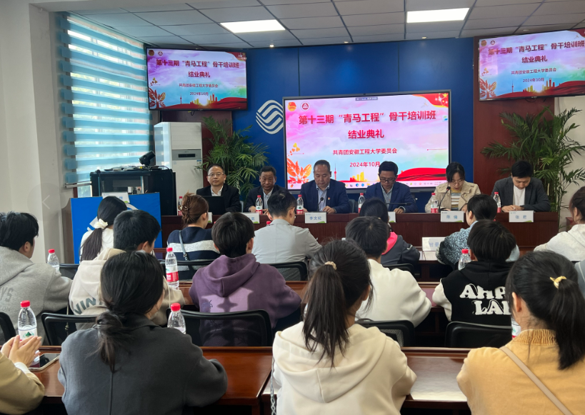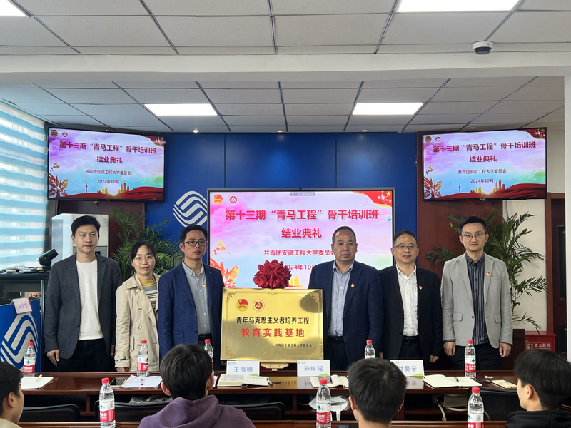 本网讯 10月23日,校第十三期“青马工程”骨干培训班结业典礼举行。校团委书记李恒奎,中移铁通芜湖分公司党总支书记、总经理李文纪,中移铁通芜湖分公司党总支委员、副总经理李志跃,薛小滔、培训班班主任陈倩,张君、第十三期“青马工程”骨干培训班全体学员参加会议。会议由陈倩主持。