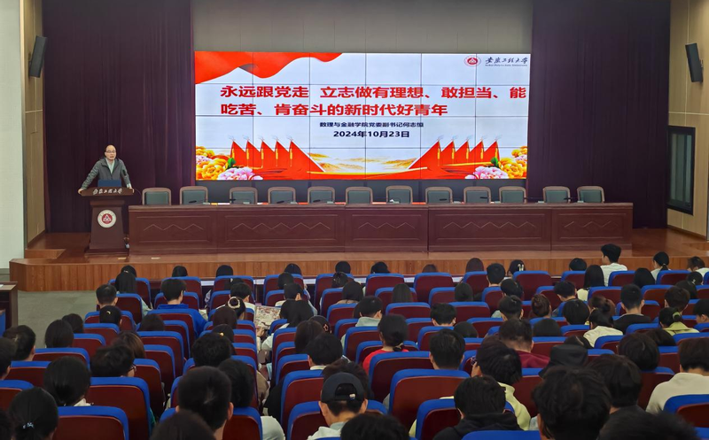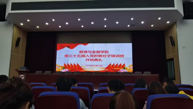 本网讯 10月23日,数理与金融学院分党校在图书馆五楼会议室举行第三十五期入党积极分子培训班开班典礼暨新生入党启蒙第一课。校党校督导组成员刘宝玉、学院党委副书记何志恒、培训班班主任、全体学员和2024级全体新生参加开班典礼。