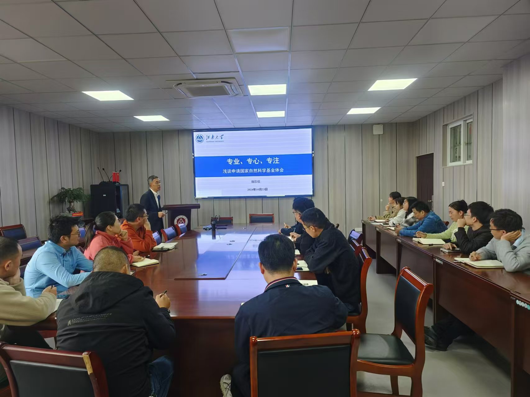 教育部新世纪优秀人才、江南大学魏取福教授为学院教师做了一场专业、专心、专注的基金辅导报告。魏取福以国家基金申报典型案例剖析了基金申报书在撰写过程中的注意事项,从基金选题、关键科学问题、立项依据、研究内容、创新性等各个环节进行全面深入的阐述,向参会老师授了基金申报的宝贵经验。鼓励教师们要注重前期科研的成果积累,为后期申报工作打下坚实基础。