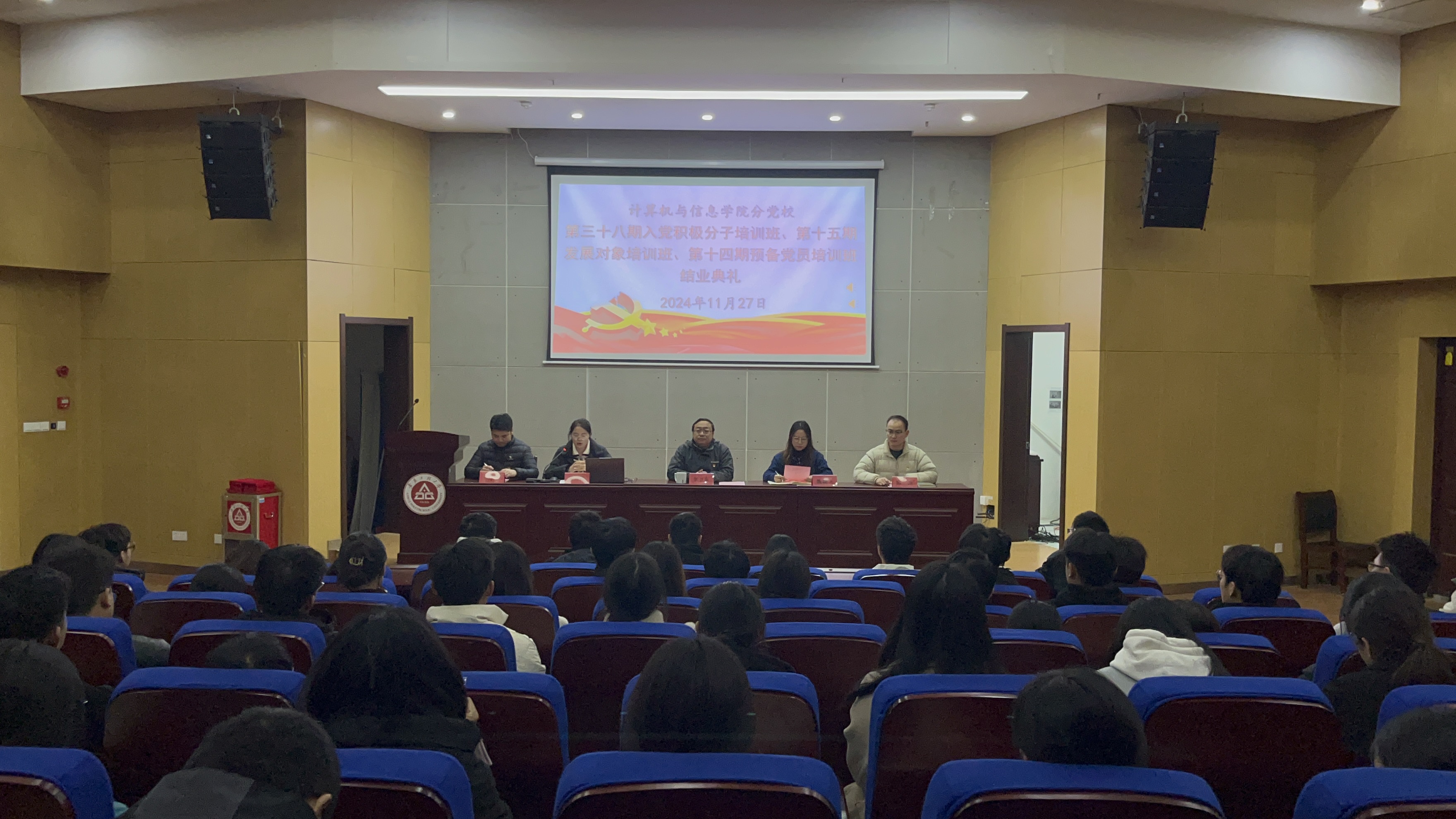 本网讯 为进一步推进学校“三全六专”育人实践,加强党员教育培训工作,严把党员“入口关”,11月27日,计算机与信息学院分党校第三十八期入党积极分子培训班、第十五期发展对象培训班、第十四期预备党员培训班结业典礼在C座5楼报告厅举行。学院党委书记李卫东,辅导员魏晓飞,培训班班主任承孝云、陈涛、周芳婷及全体学员参加,典礼由承孝云主持。