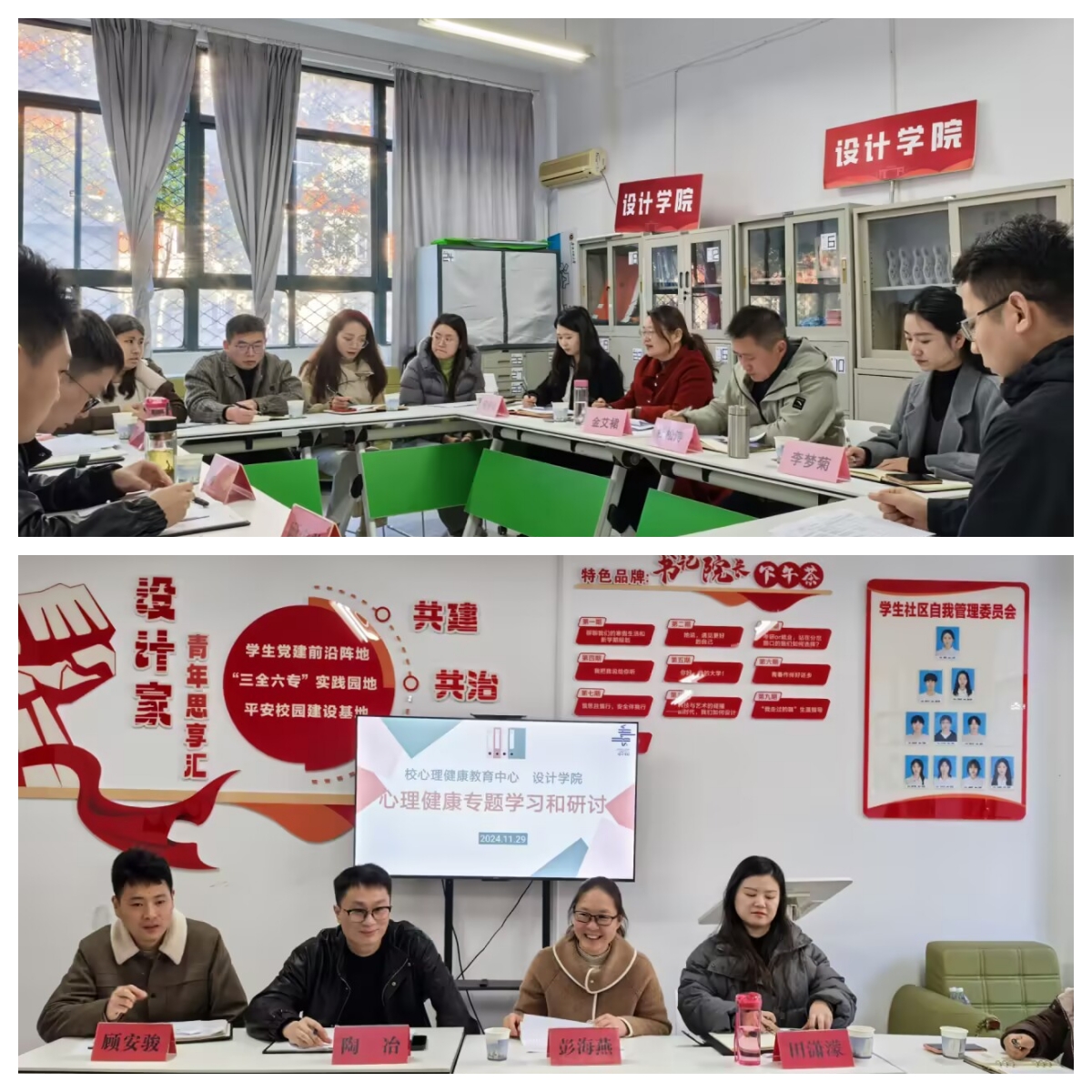 本网讯 为深入落实学校“三全六专”育人实践,全面提升学工队伍的专业素养,强化对学生心理问题的识别能力,提升心理育人实效,11月29日,设计学院联合校心理健康教育中心设计学院一站式学生社区开展心理健康教育专题研讨。校心理健康教育中心主任金艾裙,学生处副处长、中心副主任杜松涛、设计学院党委副书记(主持工作)彭海燕、党委书记助理陶冶及中心专职教师,设计学院全体辅导员共同参加研讨。