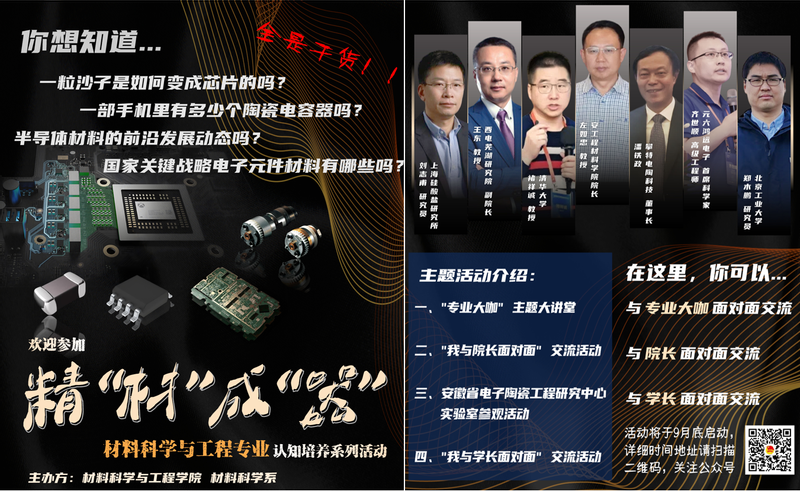 本网讯 材料科学与工程学院于9月28日至11月30日期间组织开展了“精”材成“器”材料科学与工程专业认知培养系列活动,活动共8期,分为多个主题,包括“专家大咖讲座”、“我与院长面对面”、安徽省电子陶瓷工程研究中心实验室参观交流等。材料学院院长左如忠、材料科学系全体教师以及材料科学与工程专业大一新生参与活动。