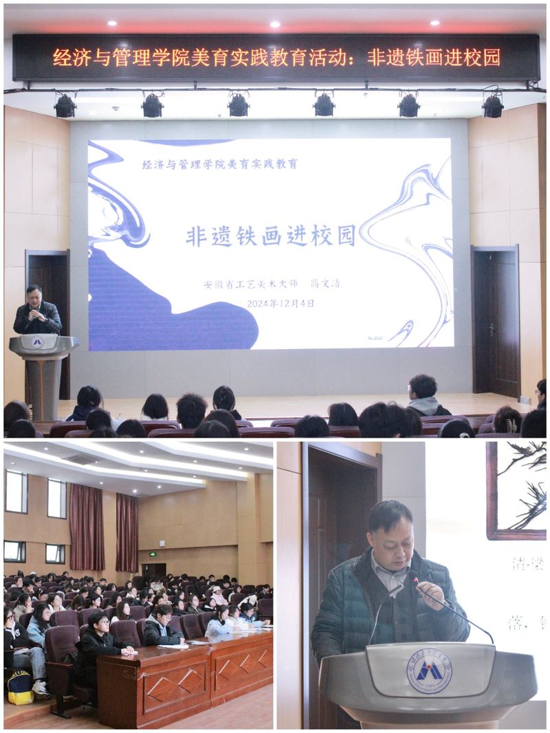 本网讯 为增进青年大学生对中华优秀传统文化的了解,感受非遗魅力,提升动手实践能力,经济与管理学院于12月4日在c座7楼报告厅和一站式学生社区105室举办铁画宣传活动与铁画锻制技艺培训与体验活动。本次活动特邀安徽省工艺美术大师、芜湖市工艺美术协会会长高文清等多位芜湖铁画传承人莅临指导,经济与管理学院同学共同参与。