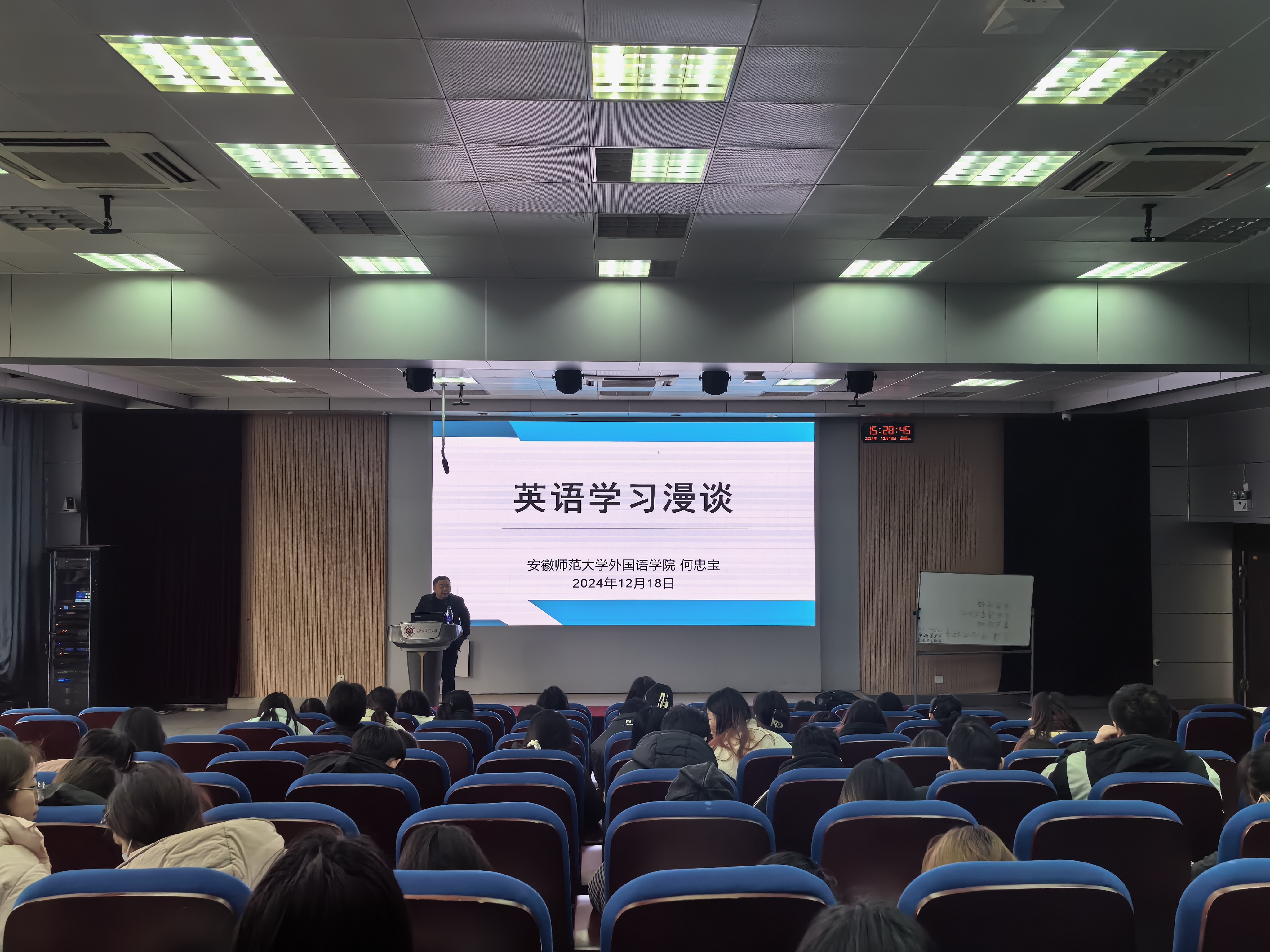 本网讯 为推进学校个性化人才培养,拓展专业知识结构,提升专业素养,帮助同学们做好职业规划,夯实专业根基,12月18日,外国语学院邀请安徽师范大学何忠宝博士、安徽省金宁外事服务有限公司资深留学顾问易荣老师在5教117为英语专业22级和23级本科生开展“英语学习漫谈”和“职业发展和出国留学指导”讲座,学院副院长李新国参加会议,带班辅导员主持会议。