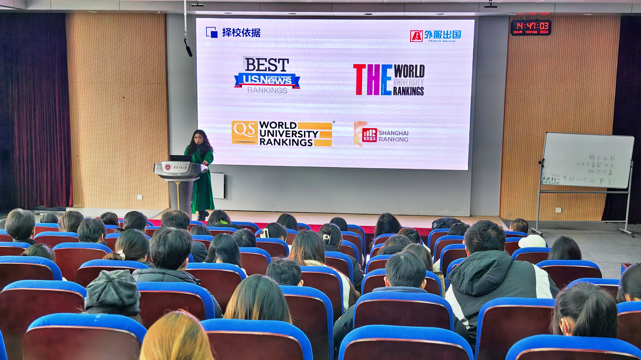 易荣结合自身工作经验,围绕英语专业出国留学方面,向同学们讲解出国留学相关信息,帮助同学们更好了解出国留学相关事项。她以互动问答的方式列出出国留学的基本信息,从英语专业留学关键点、专业方向、硕博留学申请基本材料等方面为同学们详细介绍了出国留学的相关事项。她还为同学们介绍了安徽省金宁外事服务有限公司所提供的特色服务,衷心希望能为同学们出国留学提供帮助与指引,让更多对出国留学有想法有兴趣的同学们都能实现自己的梦想。