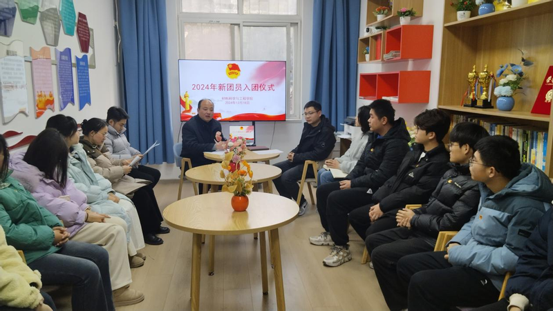 本网讯 为学习贯彻落实习近平总书记关于青年工作的重要思想,加强新团员思想政治教育,进一步增强新团员对团组织的归属感,树立新团员的主人翁意识,推深做实“三全六专”育人实践,12月18日,材料科学与工程学院在宿舍青年议事中心举办2024年度新团员入团仪式。学院党委副书记方玖胜、团委教师兼职副书记鲁力、辅导员周冬梅、学院团委组织部负责人及2024年新团员共同参加仪式。仪式由院团委书记田园主持。