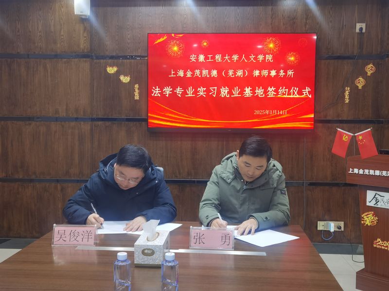 本网讯 为深入推动法学教育与法治实践深度融合发展,不断创新法治人才协同培养机制,提升学生法律实践能力,1月14日,人文学院与上海金茂凯德(芜湖)律师事务所举行合作签约暨实习就业基地揭牌仪式。上海金茂凯德(芜湖)律师事务所主任吴俊洋,律师事务所管委会主任陆在春,律师事务所事业合伙人王晓春、唐磊,学院副院长张勇,法学系教师杜蓓蕾、曹刚果,社会工作系教师梁琛琛参加签约揭牌仪式。签约揭牌仪式由上海金茂凯德(芜湖)律师事务所管委会主任陆在春主持。