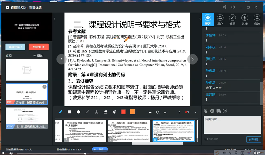 2月10日课程组开展第5次教学直播,本次活动由杨丹老师讲解撰写《程序设计基础训练》课程结课报告-课程设计说明书的要点,杨丹讲解了课程设计说明书涉及的每一部分要点,包括课程设计档案袋领取与封面信息规范填写、整体格式要求、报告内容的要求与排版,然后结合往届学生的课程设计报告范文进行了深入细致的分析讲解,对课程设计报告撰写中的共性问题加以强调,针对学生提出的相关问题进行了现场解答。