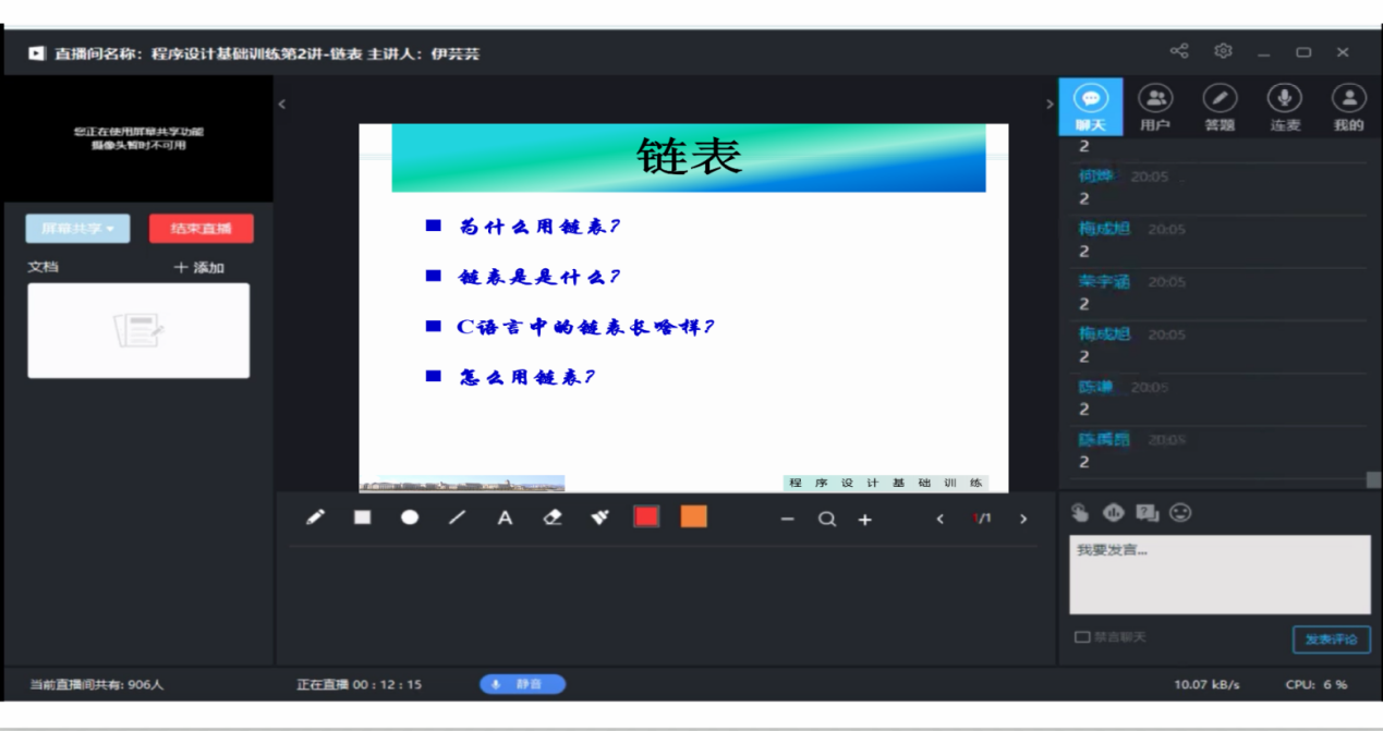 1月20日课程组开展第2次教学直播,由伊芸芸老师主讲,讲授内容为C语言程序设计中与链表结构相关的设计与实现,在接近两小时的授课过程中,同学们与课程老师积极互动,掌握了链表的使用方法以及在实际业务需求中的应用;课程在同学们热烈的讨论中圆满结束。