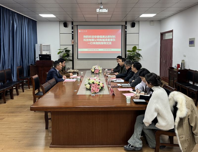 本网讯为进一步深化推进校企产学研深度合作、强化人才对接,促进就业工作再上新台阶,3月5日,安徽福美达新材料科技有限公司董事长陈福涛一行到化学与环境工程学院指导交流。科技处副处长(主持工作)王宗乾、化学与环境工程学院党政领导出席活动。学院教师、安徽福美达新材料科技有限公司挂职副总李诗,全体毕业班辅导员参加活动。会议由化学与环境工程学院党委书记章兵主持。