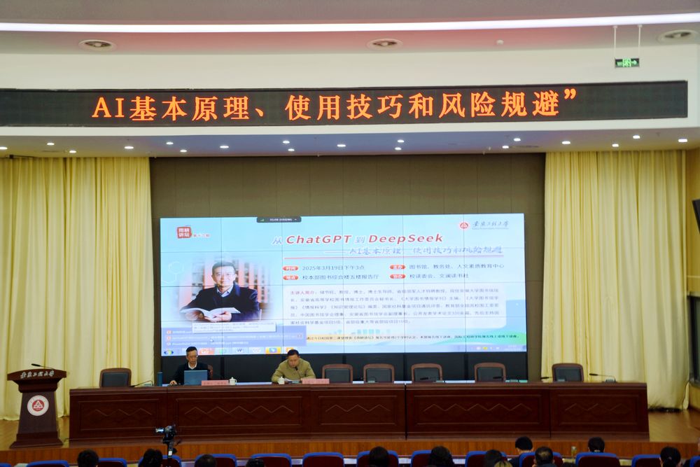 本网讯 3月19日,由图书馆、教务处、人文素质教育中心主办的第十六期雨耕讲坛在图书综合楼五楼报告厅举行,安徽大学图书馆馆长、博士生导师储节旺教授受邀为我校师生作题为《从ChatGPT到DeepSeek:AI基本原理、使用技巧和风险规避》的专题讲座。讲座以线上线下方式同时进行,芜湖市图书馆、皖南医学院图书馆和我校400余名师生现场参与。讲座由图书馆副馆长王中江主持。