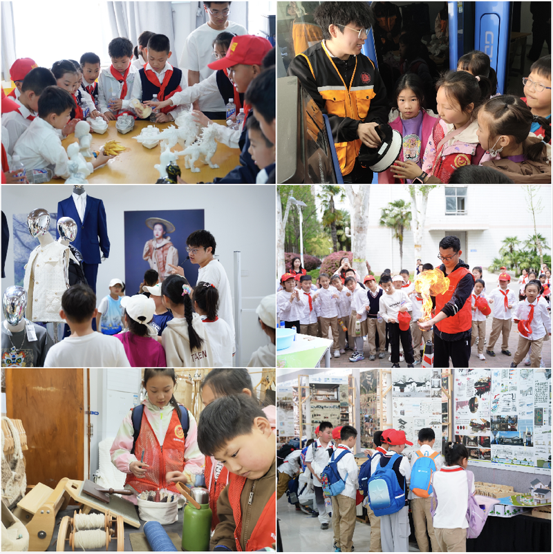 活动中,各学院团委采用“专业+思政”实践教学模式,紧密结合学校工科办学特色,着力打造具有地域、学校、学科及产业特色的科技思政教育品牌,并开展了特色鲜明的志愿服务活动。小学生们参观了学校图书馆广场的借阅区和自习区,深切领略了图书馆丰富藏书的深厚底蕴。他们走进材料科学与工程学院,现场观摩3D打印技术及增材制造研究院的前沿成果;在化学与环境工程学院实验室,孩子们不仅目睹了前沿科研成果,还观看了大学生志愿者带来的“火焰掌”“人造雪”“火山喷发”等趣味实验;在纺织服装学院,小学生们了解了芜湖浆染工艺的历史、发展及制作流程,近距离接触非遗浆染实验室的各类作品,并亲身体验学院展厅的纺织“黑科技”;在设计学院展厅,孩子们被2024届优秀毕业作品所吸引,栩栩如生的产品模型激发了他们对设计创新的浓厚兴趣,在心中悄然种下创意的种子。