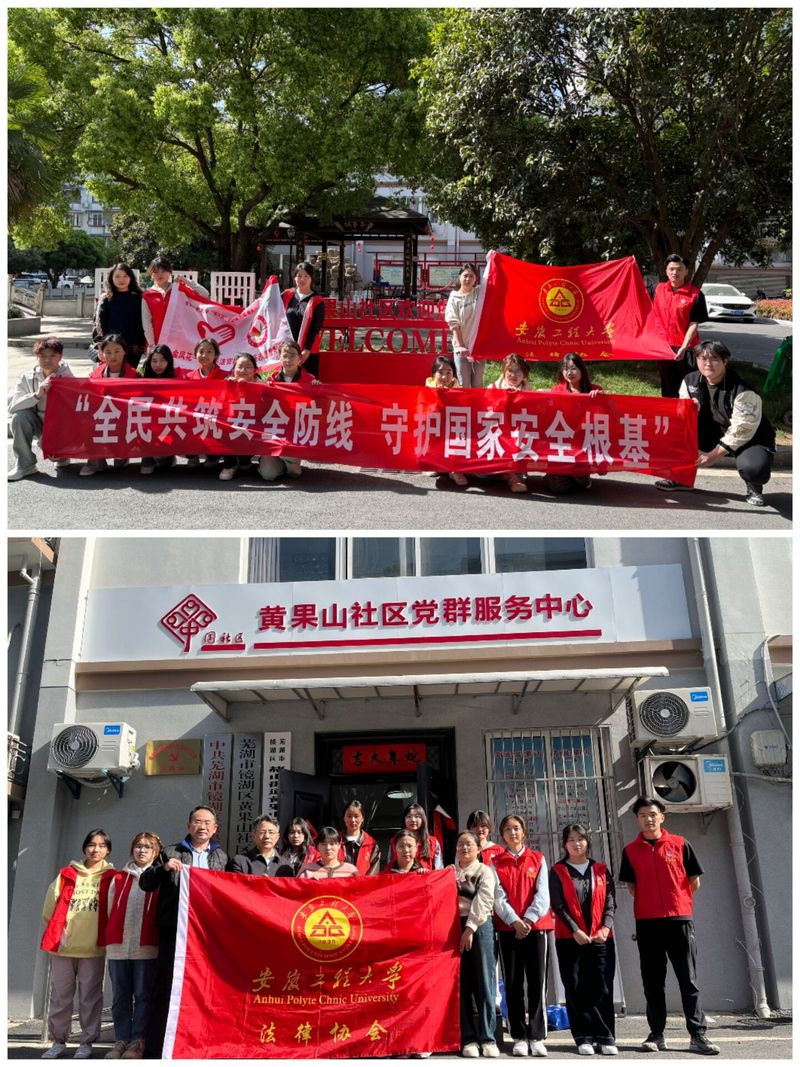 在镜湖区赭山街道黄果山社区,法律协会功能型团支部、校法律援助工作站、校第十三季“团百花”学雷锋志愿服务行动铜奖项目“金凤花”志愿团队成员,在学院法学系专任教师、团委副书记、社区工作人员的带领下,联合开展国家安全法普法宣传“团百花”志愿服务活动。活动期间,志愿者们通过悬挂横幅、发放宣传手册、设置咨询台等方式,向社区居民普及《中华人民共和国国家安全法》《中华人民共和国反间谍法》《反分裂国家法》等法律法规,用通俗易懂的语言讲解危害国家安全的常见行为,提醒社区居民“国家安全无小事”,日常生活中需提高警惕。居民们积极参与,并对本次活动给予高度评价,纷纷表示对总体国家安全观有了更加深入的理解和认识。