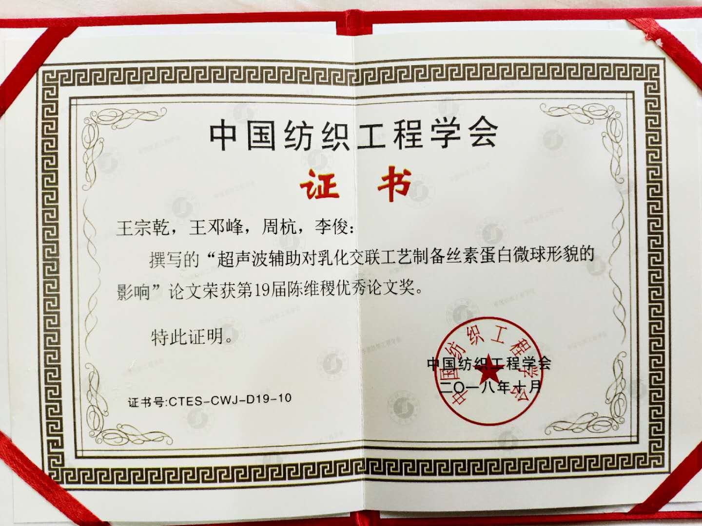 近日,由中国纺织工程学会组织举办的“2018中国纺织学术年会”在西安举行。来自全国十余家纺织院校师生和相关企业代表参加了此次年会。毕松梅教授带领16名师生参加了年会,会上颁发了中国纺织学术大奖、纺织学术和技术带头人奖、纺织青年科技奖,百草纤维纺织科技成果转化贡献奖,陈维稷优秀论文奖等。我校教师王宗乾指导的研究成果《超声波辅助对乳化交联工艺制备丝素蛋白微球形貌的影响》喜获第19届“陈维稷优秀论文奖”。