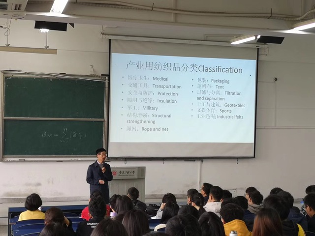 430日上午,邱夷平在5J217教室为纺织工程专业一、二、三年级学生做了题为《新型产业用纺织品》的精彩报告。报告围绕东华大学纺织学院在新型产业用纺织品领域的学术成果和产品开发展开,深入简出的阐述了小纺织大作为的行业发展前景,如天上飞的天宫二号飞船太阳能帆板是针织结构柔性可折叠高精尖纺织品,地上跑的地铁列车顶板、隔离板、车盖板系列纺织基复合材料,海里的核电站冷源综合防御系统工程用的智能纤网,民用中的PM2.5口罩等,正可谓纺织制造上可九天揽月、下可五洋捉鳖,邱教授生动风趣的演讲赢得了同学们的阵阵掌声,极大地增强了同学们的专业自信。