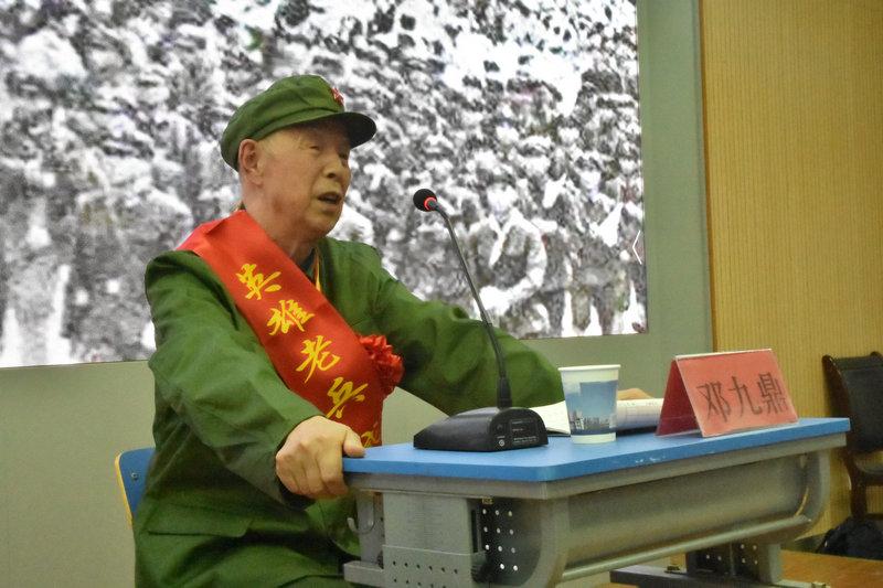 85岁高龄的中国人民解放军原骑兵一师邓九鼎同志动情的讲述他33年的军旅生涯,15岁入伍的他加入的本是为入朝作战准备的部队,后受军委指派转战西北剿匪,克服了物资匮乏、自然条件艰苦、武器装备简陋等诸多不利因素,最终在甘南完成了上级交付的剿匪任务,虽然有着当地人民的大力支持,但是还是有不少的战友为了社会的稳定和国家的安宁牺牲在了战场。邓老语重心长的告诫青年学生要拥护共产党的领导,珍惜时光。北海舰队老兵张志同也感触颇多,作为红二代,受八路军父亲为人民服务的人生态度和军人特质的影响,让他从小就立志从军,最终姐姐和他自己都光荣的加入了中国人民解放军。他介绍了父亲作为一名老革命一颗手榴弹的作战故事,同时也介绍了父亲作为一名军人时时刻刻想着别人,服务他人的感人事迹。他还动容描绘了在青岛北海舰队服役期间担任炮兵出勤的激情岁月,指导青年学生要爱党爱民,奋勇向前。