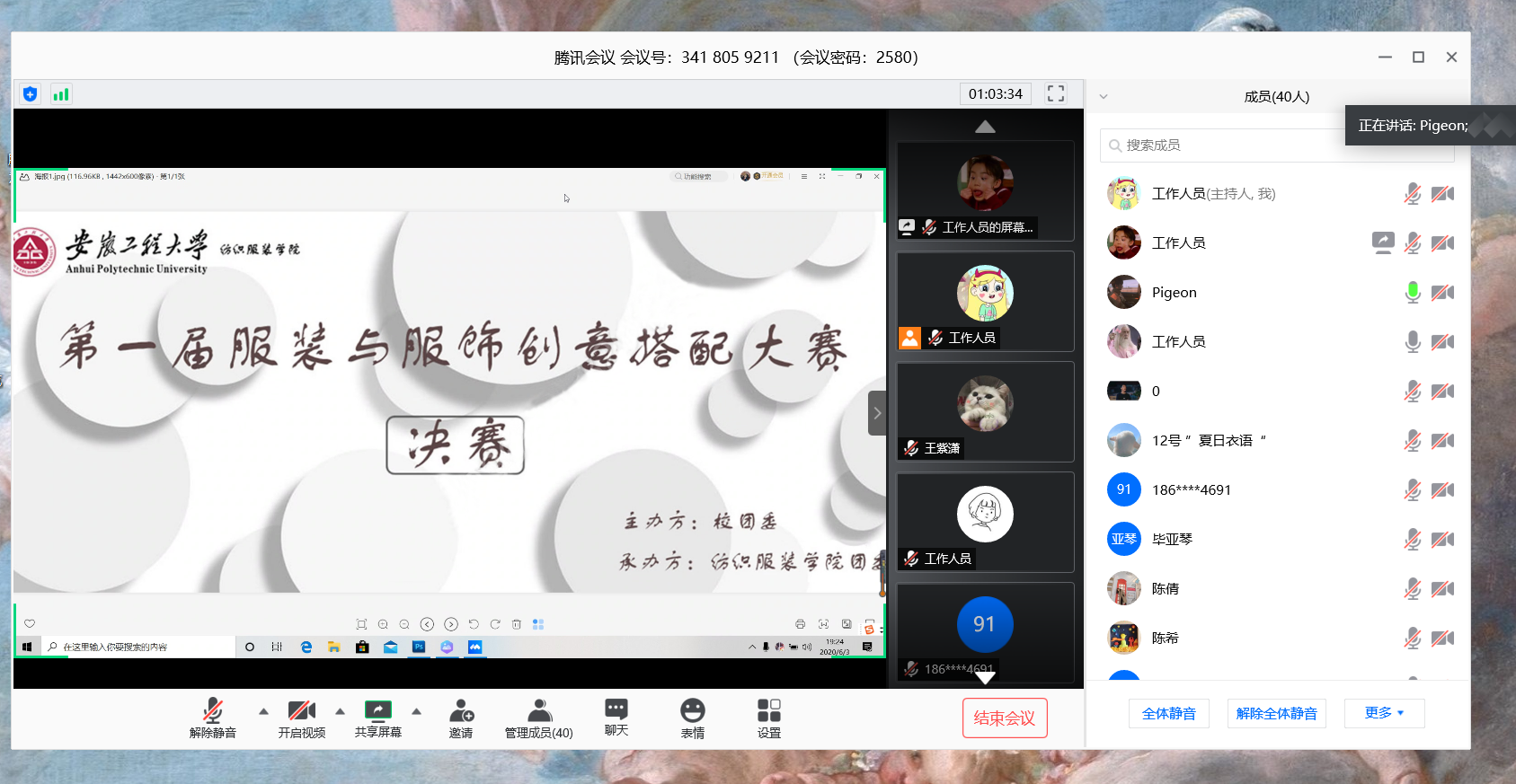 本次决赛借助腾讯会议先上举行,采取线上直播评委打分与线下观众投票相结合的方式。决赛共12名选手,每位选手按照抽签顺序依次展示参赛作品,结合PPT对作品搭配创意进行阐述。开场视频带动了整个活动氛围,线上比赛的形式丝毫不减选手们对比赛的热情和认真。作品《人间星辰》展示不同穿衣风格的搭配,看似随意,却无一不散发时尚的气息。《夏日物语》很好的诠释了夏日的穿搭潮流,让观众仿佛拥抱了一整个夏天的美好。《blove-藍》讲述同色系极简风的穿搭,清新自然,给观众带来详和舒适的视觉感受。服装系主任顾春华博士对比赛进行了点评,她表示每位选手的作品与解说都各有特色,体现了青年大学生良好的审美观念和对美的把握,在给予优秀作品表扬的同时也从专业的角度给出了合理化的建议,让参赛选手受益良多。
