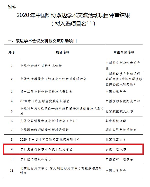 近期,中国科协公布了关于2020年中国科协双边学术交流活动项目评审结果,经形式审查和专家评审,共有31个项目列入本年资助项目。我校纺织服装学院申报的《中日复合材料学术与技术交流活动》获批双边学术会议及科技交流活动项目,这也是我校首次获批此类项目。