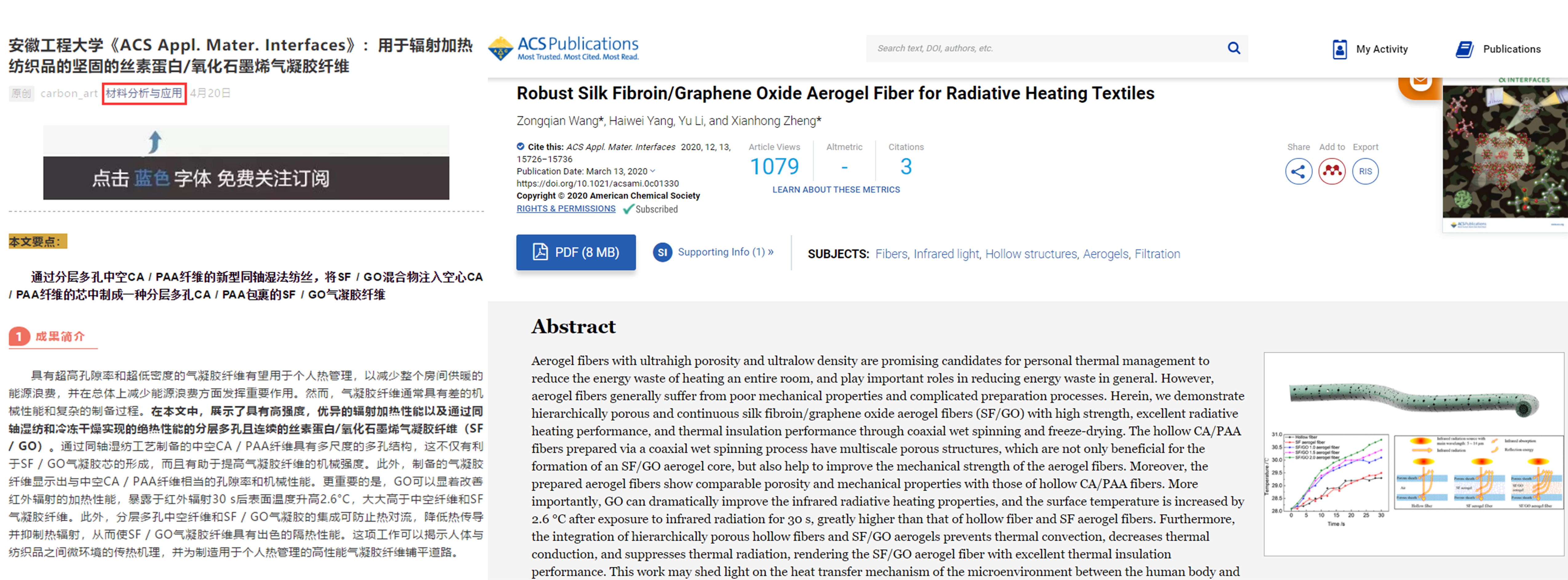 相关成果以“Robust Silk Fibroin/Graphene Oxide Aerogel Fiber for Radiative Heating Textiles”为题在ACS Applied Materials & Interfaces(IF:8.758,中科院一区TOP期刊)上发表后,材料领域微信公众号—“材料分析与应用”也以“日韩欧美福利视频_黑人巨大人精品欧美三区_欧美成人另类人妖_欧美在线精品一区二区三区_欧美一区二区三区性视频_日韩精品欧美视频_性欧美极品xxxx欧美一区二区《ACS Appl. Mater. Interfaces》:用于辐射加热纺织品的坚固的丝素蛋白/氧化石墨烯气凝胶纤维”为题进行了重点报道,并在智能可穿戴领域引起广泛关注,目前该论文浏览量已经超过1000余次。该论文第一、二作者分别为王宗乾和2017级研究生杨海伟,通讯作者为郑贤宏博士。此外,该研究成果也得到了安徽省重点研究和发展计划项目(1804a09020077)、芜湖市科技计划项目(2018pt04)、安徽省重大科技专项(201903a05020028)和日韩欧美福利视频_黑人巨大人精品欧美三区_欧美成人另类人妖_欧美在线精品一区二区三区_欧美一区二区三区性视频_日韩精品欧美视频_性欧美极品xxxx欧美一区二区引进人才科研启动基金(2020YQQ002)等项目的支持。