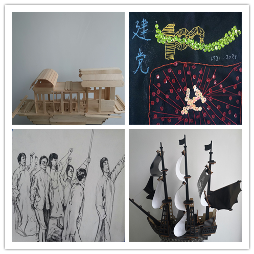 《南湖红船》由小木棒搭建,层层覆盖的木棒打造了红船的模型。“南湖红船”为中共一大召开之地,创作者希望通过这个作品让大家牢记“红船精神”;《乘风破浪》意寓党的一百年是艰苦奋斗的一百年,更是乘风破浪的一百年,党的大船永与时代同行;《“莲”政》以“莲花”为主题,通过剪纸的形式赞誉中国共产党的纯洁;《献礼建党百年》以水彩画的形式向我们展现北京天安门的伟岸;《建党百年》用水彩笔绘画出中国长城与守卫它的士兵,代表中国共产党忠心守家为国的决心。所有的参赛作品围绕“献礼建党百年”主题,别出心裁,各有一番风味,带给观众别样的感受。