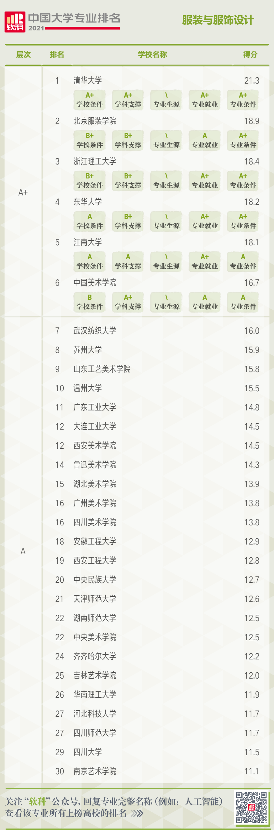 2021622日,高等教育评价专业机构软科正式发布2021“软科中国大学专业排名”。每个专业榜单发布的是开设该专业并排名位列前50%的高校,服装与服饰设计专业共有150所高校上榜,我校服装与服饰设计专业位列第18位。
