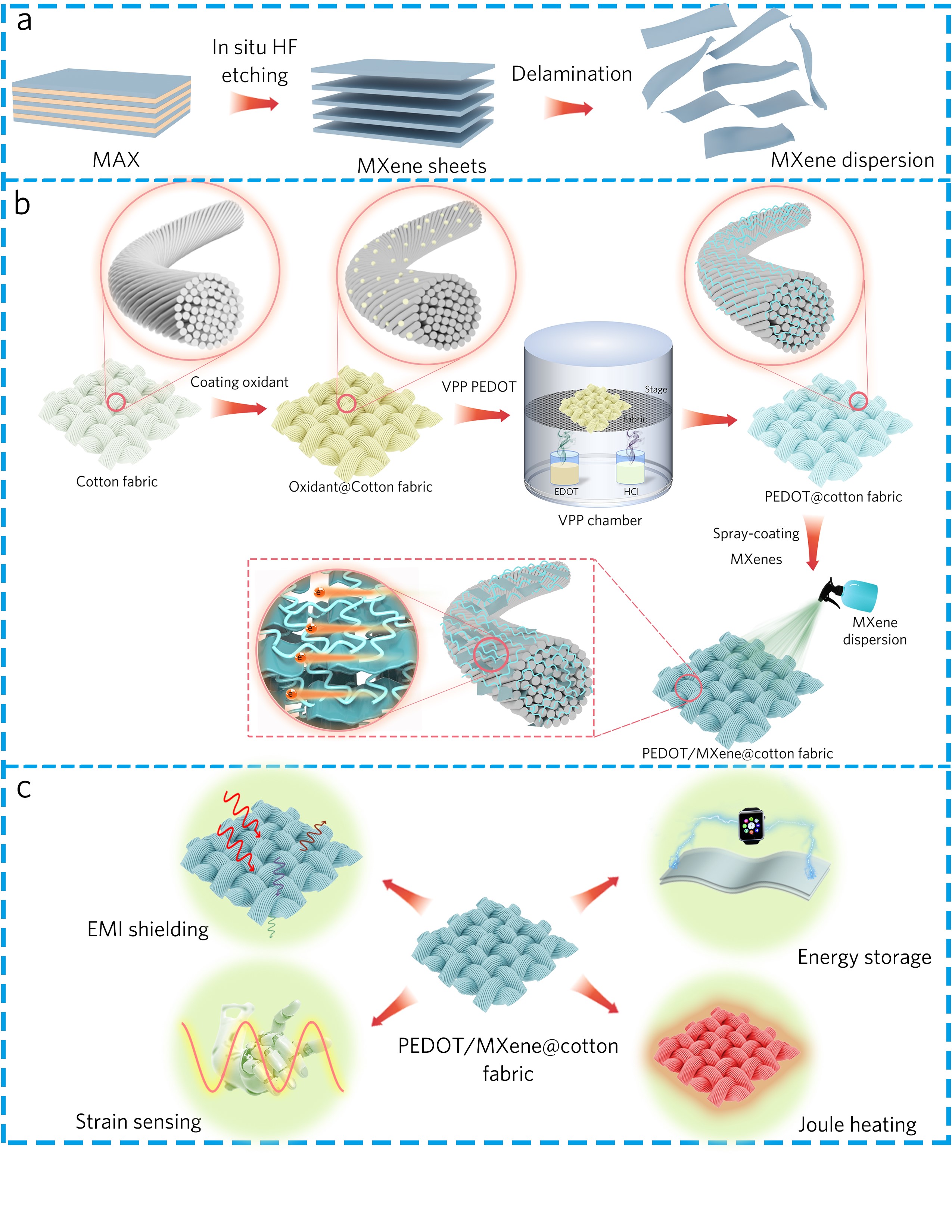 多功能集成纺织品一直被认为是一种理想的可穿戴电子器件的制备方法。然而,织物在功能集成的过程中如何不牺牲织物固有性能始终是一项重要挑战。针对上述问题,我校纺织服装学院智能可穿戴研究团队经过长期研究攻关,取得系列重要进展,相关成果分别以“Vapor phase polymerized conducting polymer/MXene textiles for wearable electronics”和“Multifunctional RGO/Ti3C2Tx MXene fabrics for electrochemical energy storage, electromagnetic interference shielding, electrothermal and human motion detection”为题发表于Nanoscale(中科院1TOP,IF=6.895)和Materials & Design(中科院1TOP,IF=6.289),论文均以日韩欧美福利视频_黑人巨大人精品欧美三区_欧美成人另类人妖_欧美在线精品一区二区三区_欧美一区二区三区性视频_日韩精品欧美视频_性欧美极品xxxx欧美一区二区为第一单位,第一作者为郑贤宏博士,通讯作者为王宗乾教授。该研究分别开发了一种基于石墨烯/过渡金属碳化物/氮化物(MXene)改性纺织品和气相聚合PEDOT/MXene改性纺织品,制备的纺织品具有优异的导电性、透气性和柔韧性,展现出优异的电化学性能(比电容:1000 mF/cm2),电热性能(表面温度:193.1°C)和电磁屏蔽性能(屏蔽效能,36.62 dB),并具有优异的低应变传感性能,可用于检测人体多种运动状态。该研究成果在智能纺织品领域具有广泛的应用前景,为功能性纺织品的结构设计提供了新方法和新思路,为智能可穿戴器件的发展奠定了基础。