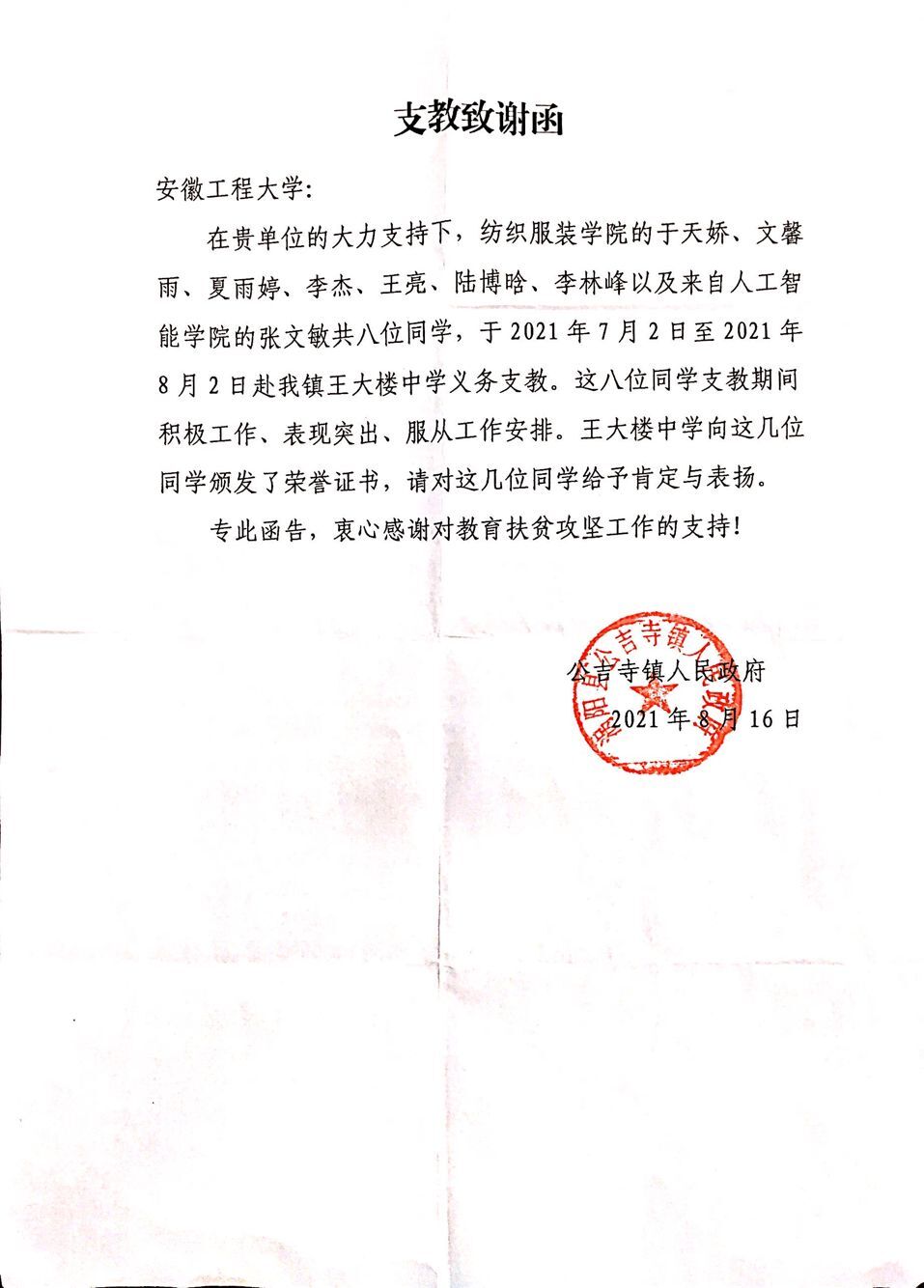 “这八位同学支教期间积极工作、表现突出、服从工作安排。王大楼中学向这几位同学颁发了荣誉证书。请对这几位同学给予肯定和表扬。专此函告,衷心感谢对教育扶贫工作的支持......”。近日,日韩欧美福利视频_黑人巨大人精品欧美三区_欧美成人另类人妖_欧美在线精品一区二区三区_欧美一区二区三区性视频_日韩精品欧美视频_性欧美极品xxxx欧美一区二区收到了一封来自安徽省亳州市涡阳县公吉寺镇人民政府的支教致谢函,感谢我校纺织服装学院志·青春团队对当地教育扶贫工作的支持。